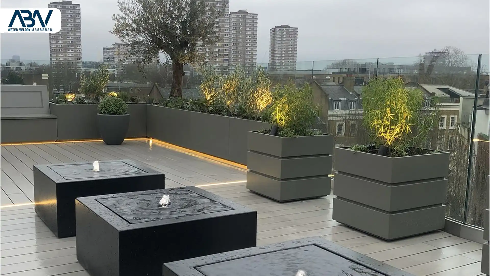در روفگاردنها، آبنماهای فایبرگلاس یا فلزی با طراحی مدرن، فضایی شیک و کاربردی ایجاد میکنند. سیستمهای کنترل هوشمند، مدیریت آب را در این فضاها بهینه میکنند.