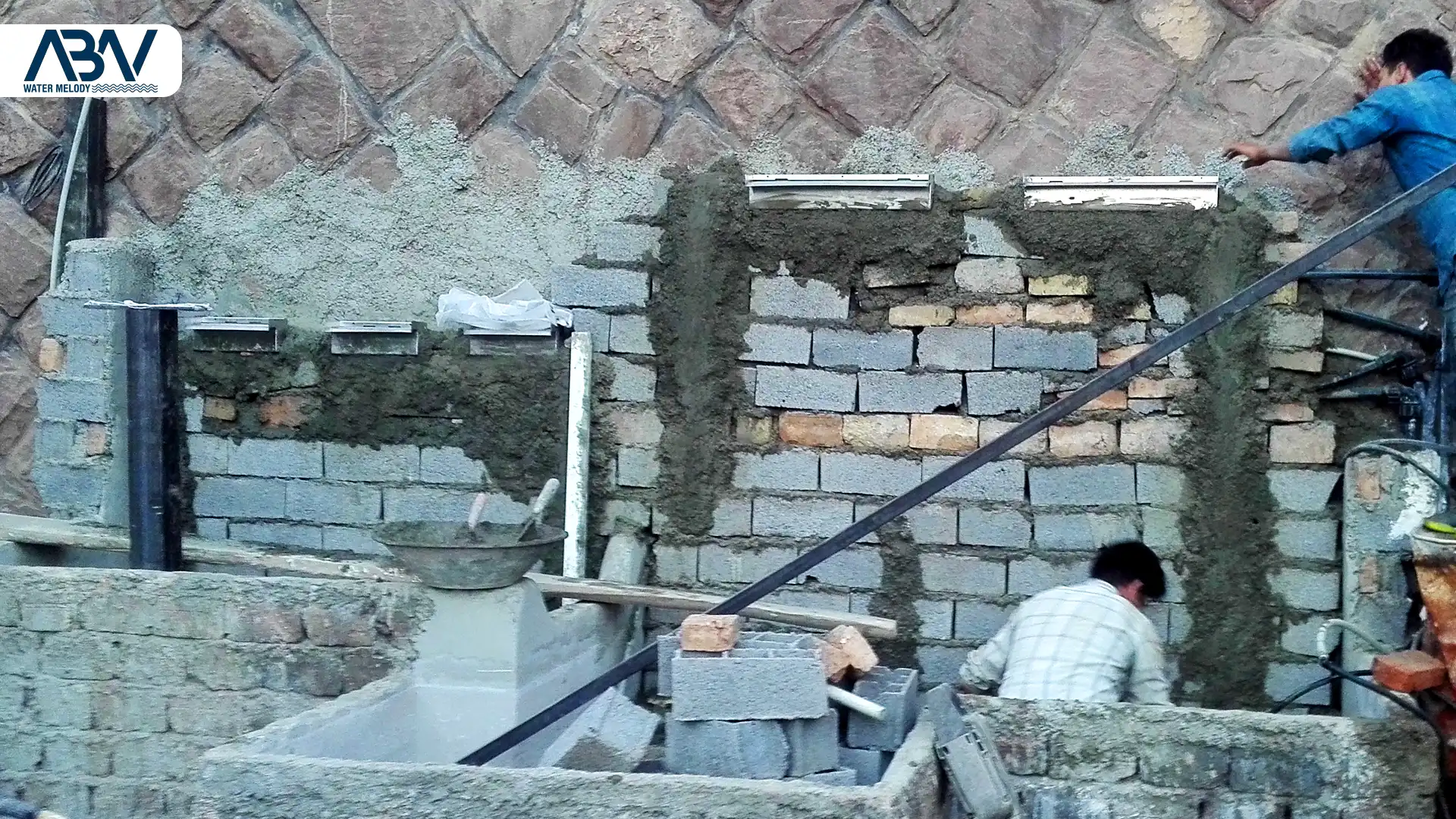 نصب پمپ و فیلتراسیون: پمپ آبنما (ترجیحاً مستغرق برای فضاهای کوچک) و سیستم فیلتراسیون برای گردش و تصفیه آب نصب شوند. کلرزن خطی یا نمکی برای ضدعفونی توصیه میشود.
